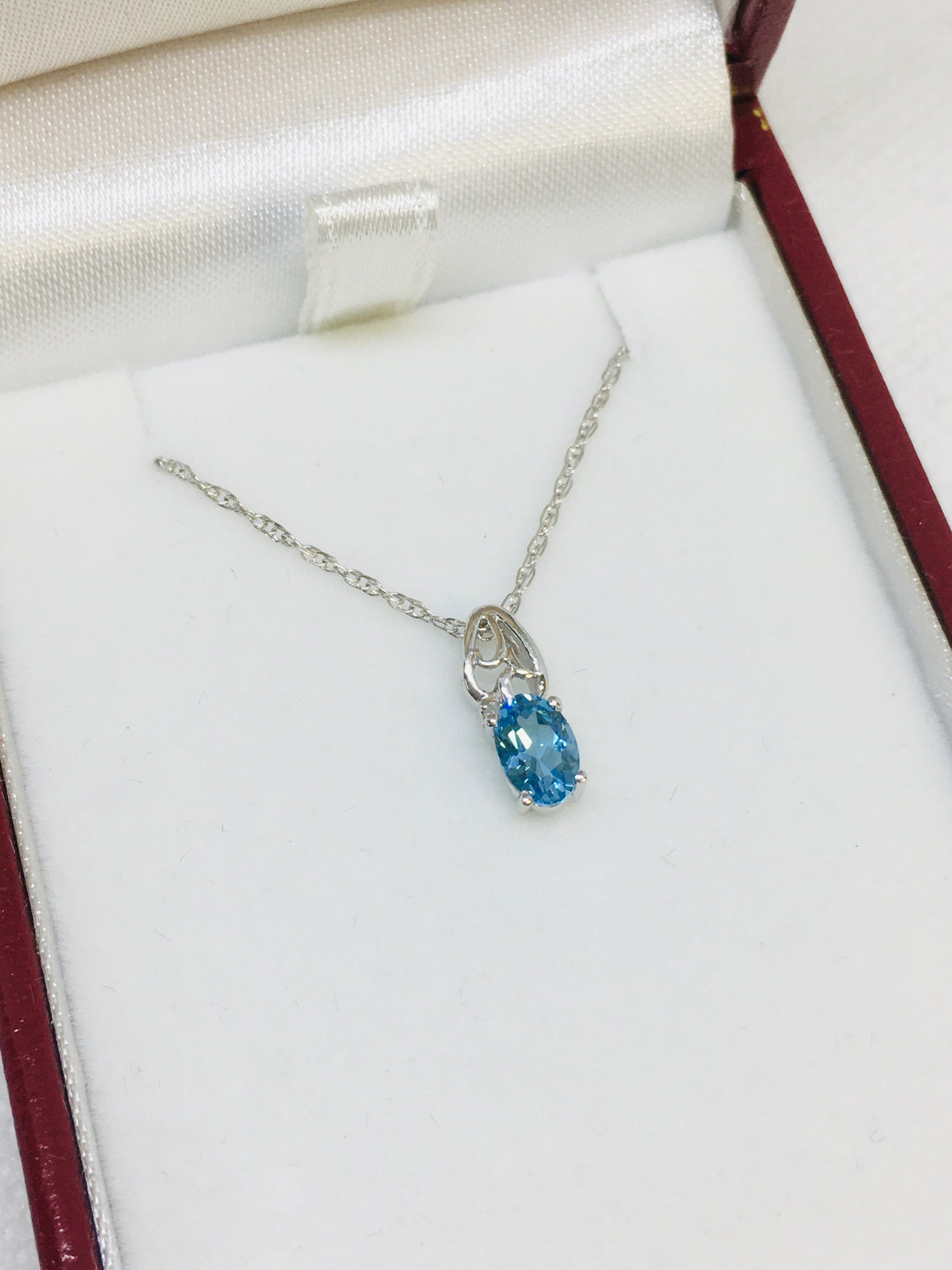 Genuine Oval Blue Topaz with a diamond accent! Mounted in 14K White Gold. Chain is white gold as well and is 18 inches long.