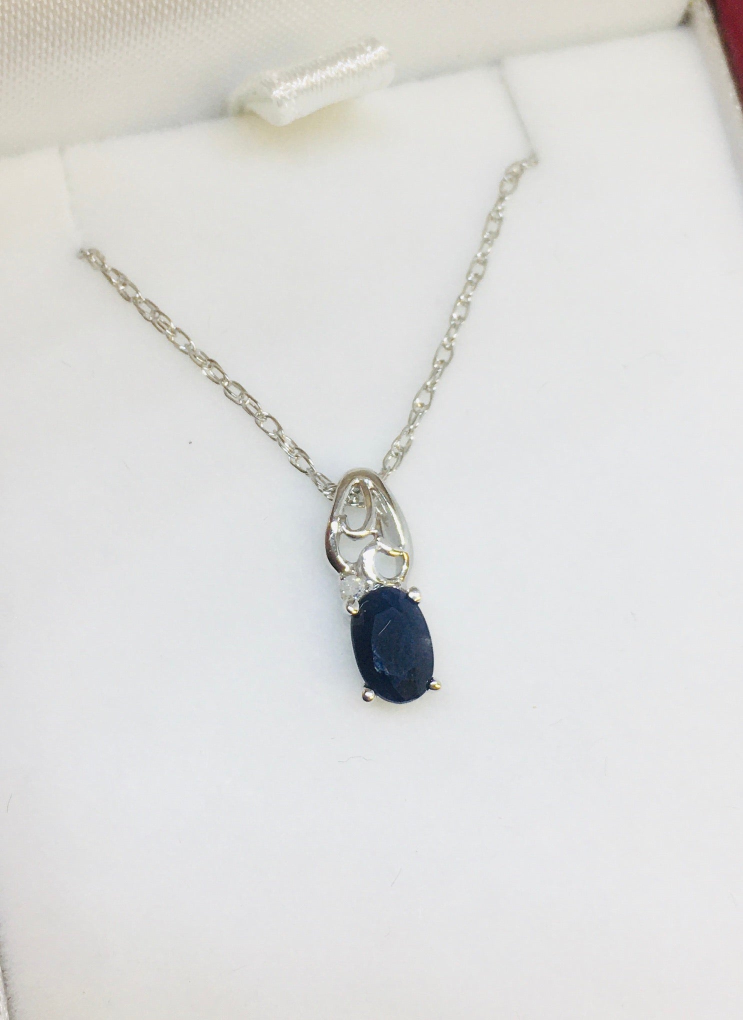 Genuine Oval Sapphire with a diamond accent! Mounted in 14K White Gold with a 18 inch chain.