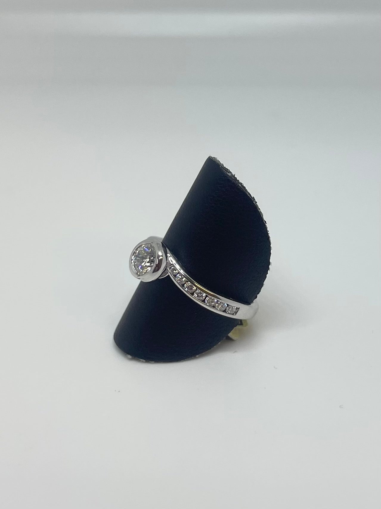 Engagement ring: It is 14k white gold with a .50ctw center, round diamond. Its diamond grade is SI2 I. The diamond down the side are channel set while the center is bezel set!