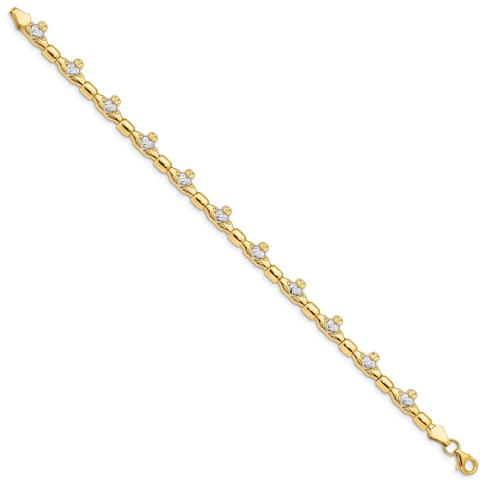 Made of 14k gold, this bracelet has little white hearts throughout to give a two tone look! It’s 7.25” long and the hearts have a brushed texture for more effect!