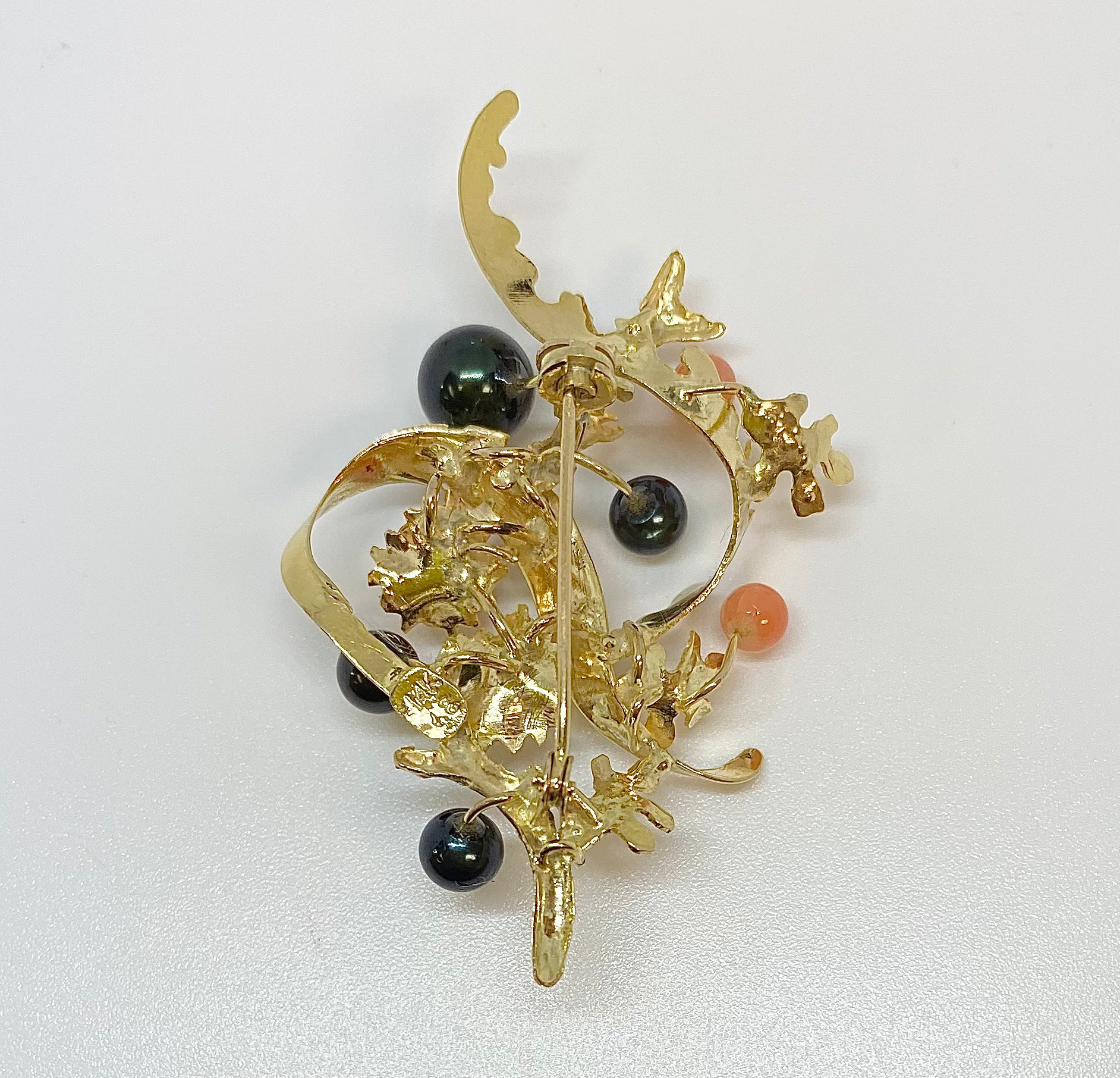 Coral and Black Pearl Gold Brooch