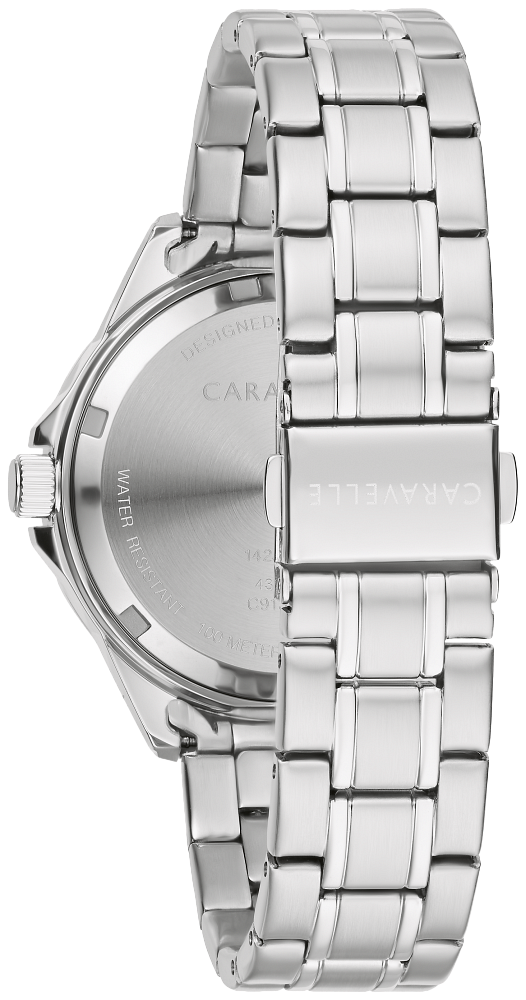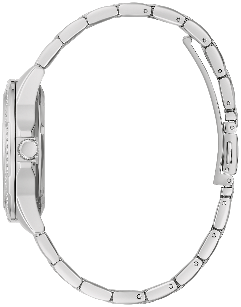 For all-day dazzle, this Aqualuxx luxury sport watch sparkles with 42 brilliant crystals. In stainless steel with silver-tone finish, blue wave inspired dial texture, calendar, and double-press fold-over clasp. Water resistant to 100 meters.