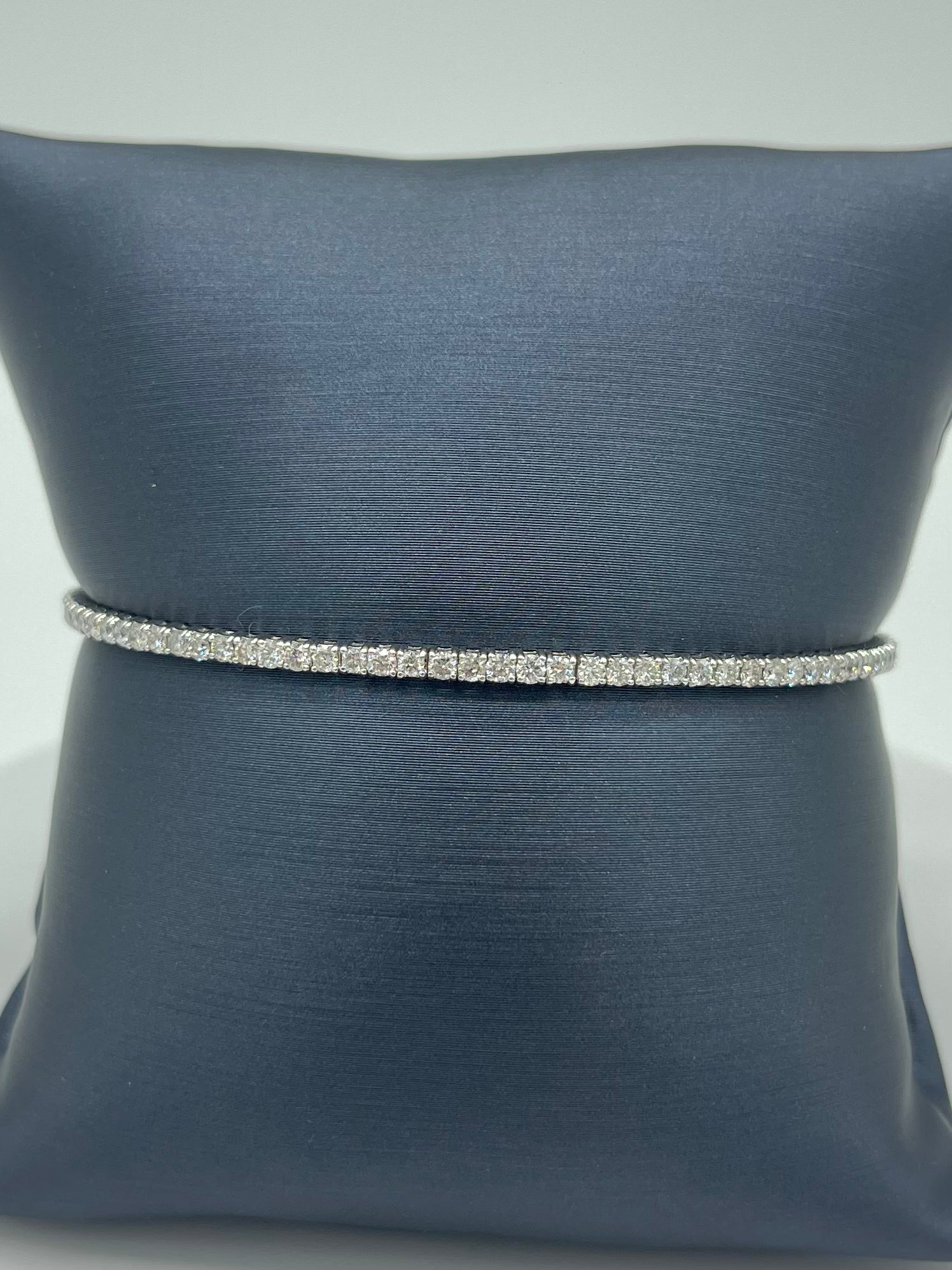 This bracelet screams glamorous! This bracelet is made of 14k white gold with a diamond weight of 1.97ctw of 1.9mm round diamonds. This bracelet has some flexibility to which allows some wiggle room and is easy to put on. Although she’s flexible, she isn’t invincible, so handle with care!