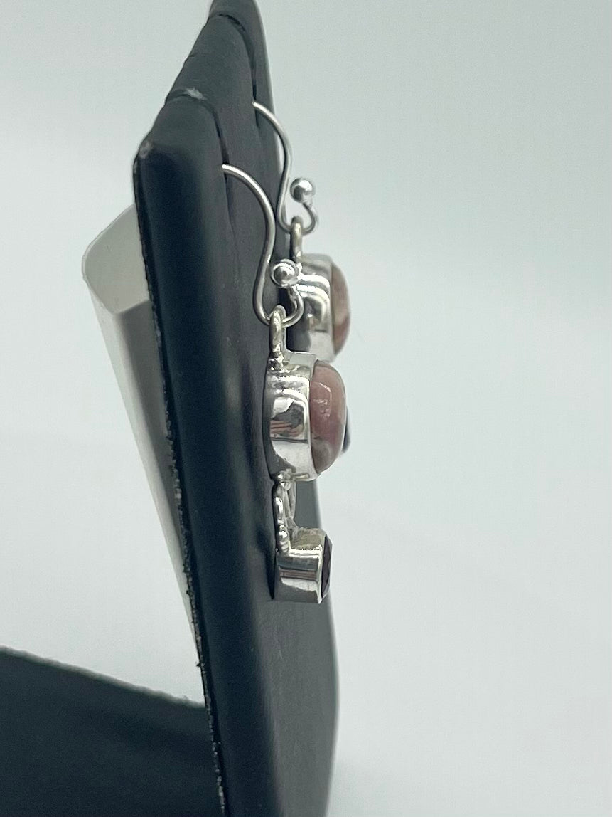 Mounted in sterling silver with French hooks are Jasper and garnet! The earring dangles at 1.5 inches with both stones complimenting each other perfectly!