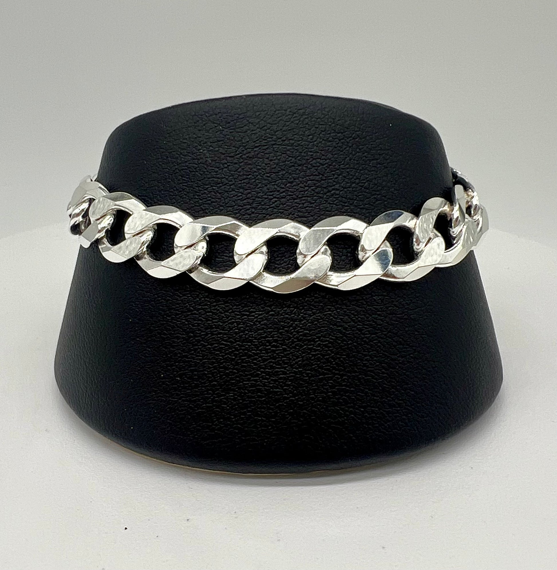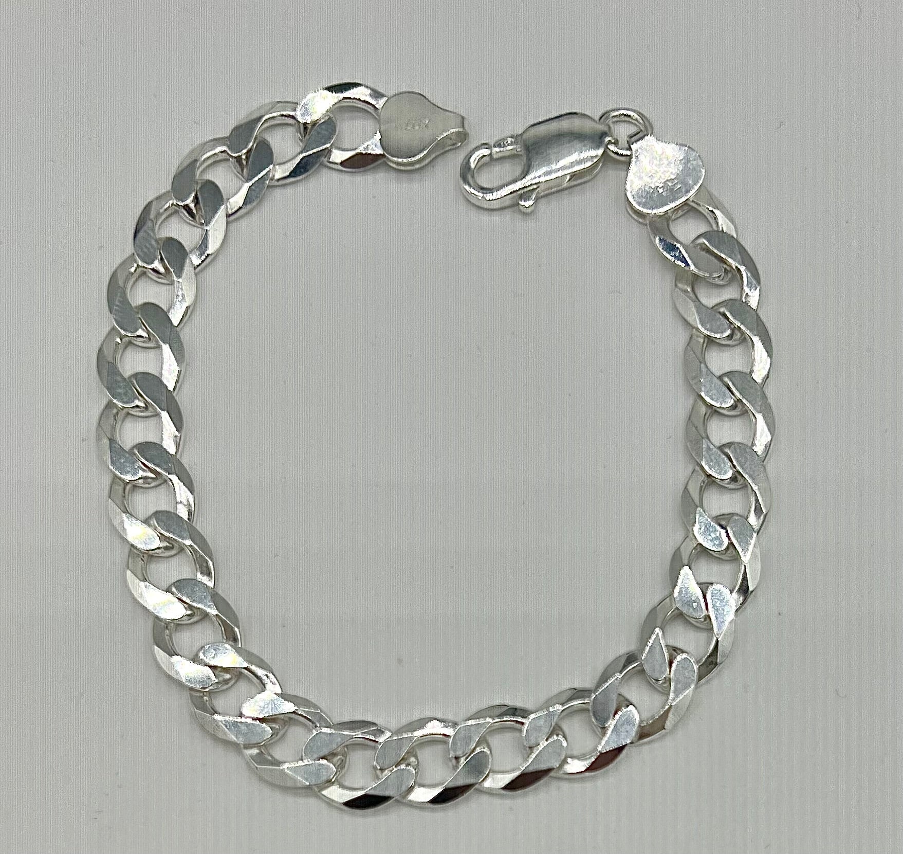 This mens bracelet is made of sterling silver and of the Curb design. The links are 8.5mm wide and it’s 8” long!