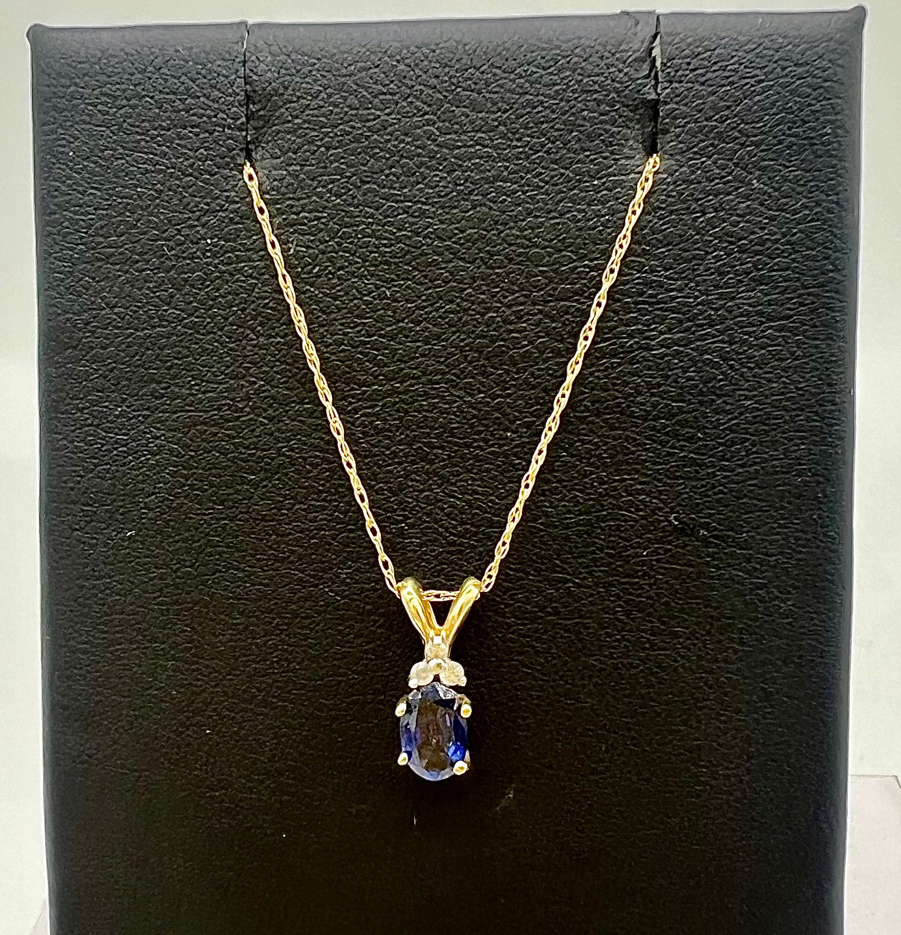 This sapphire is created in a lab and is shaped in an oval fashion at 4x6mm. It’s mounted in 14k yellow gold and has a 16” yellow gold chain as well! She is a part of our Estate Collection!