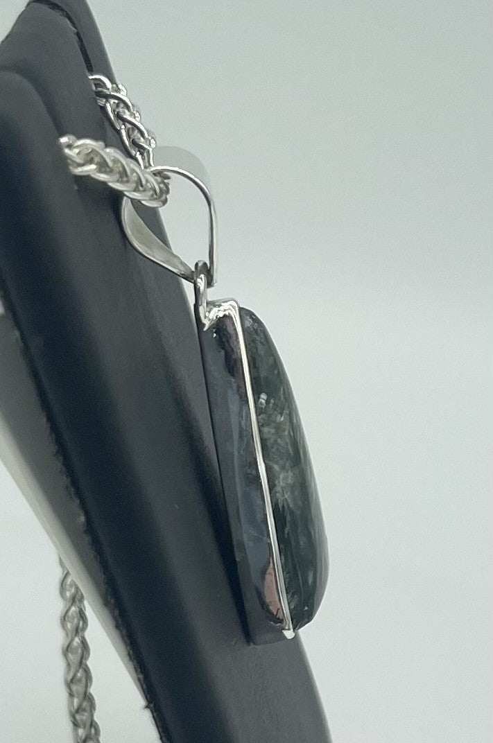 The natural stone Serpentine is a fun and mystic piece! She looks like the rushing waves of the sea during a storm! So cool!! This pendant is in sterling silver and measures 24mm x 17.5mm.
