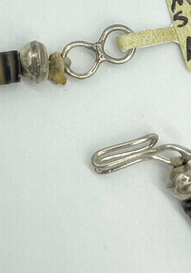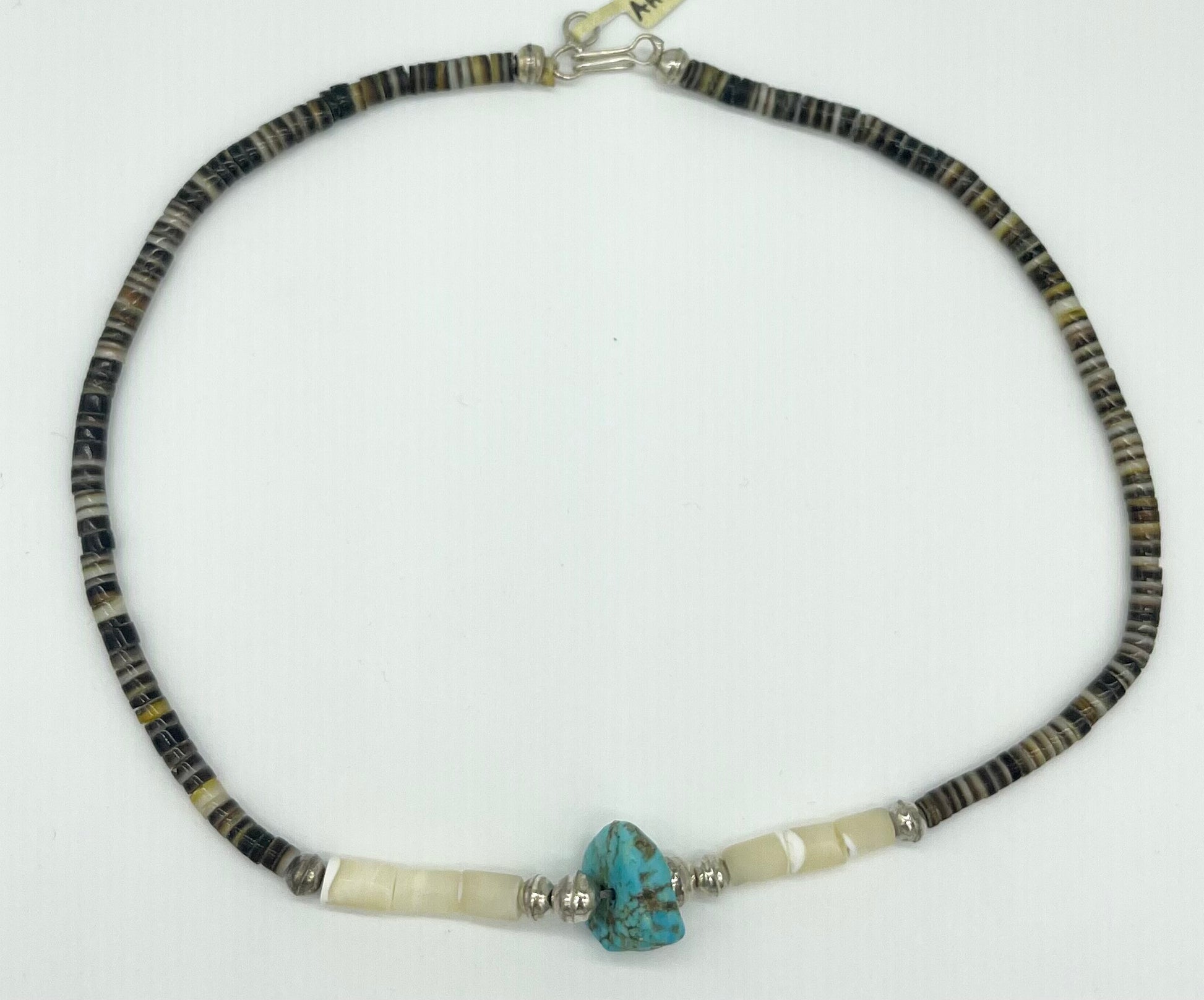Another unique find!! She’s made is sterling silver hardware, brown shell beads running down to meet cylinder Mother of Pearl beads that lead to a nugget of Turquoise. The clasp has two adjustable holes. It’s length is 15 inches.