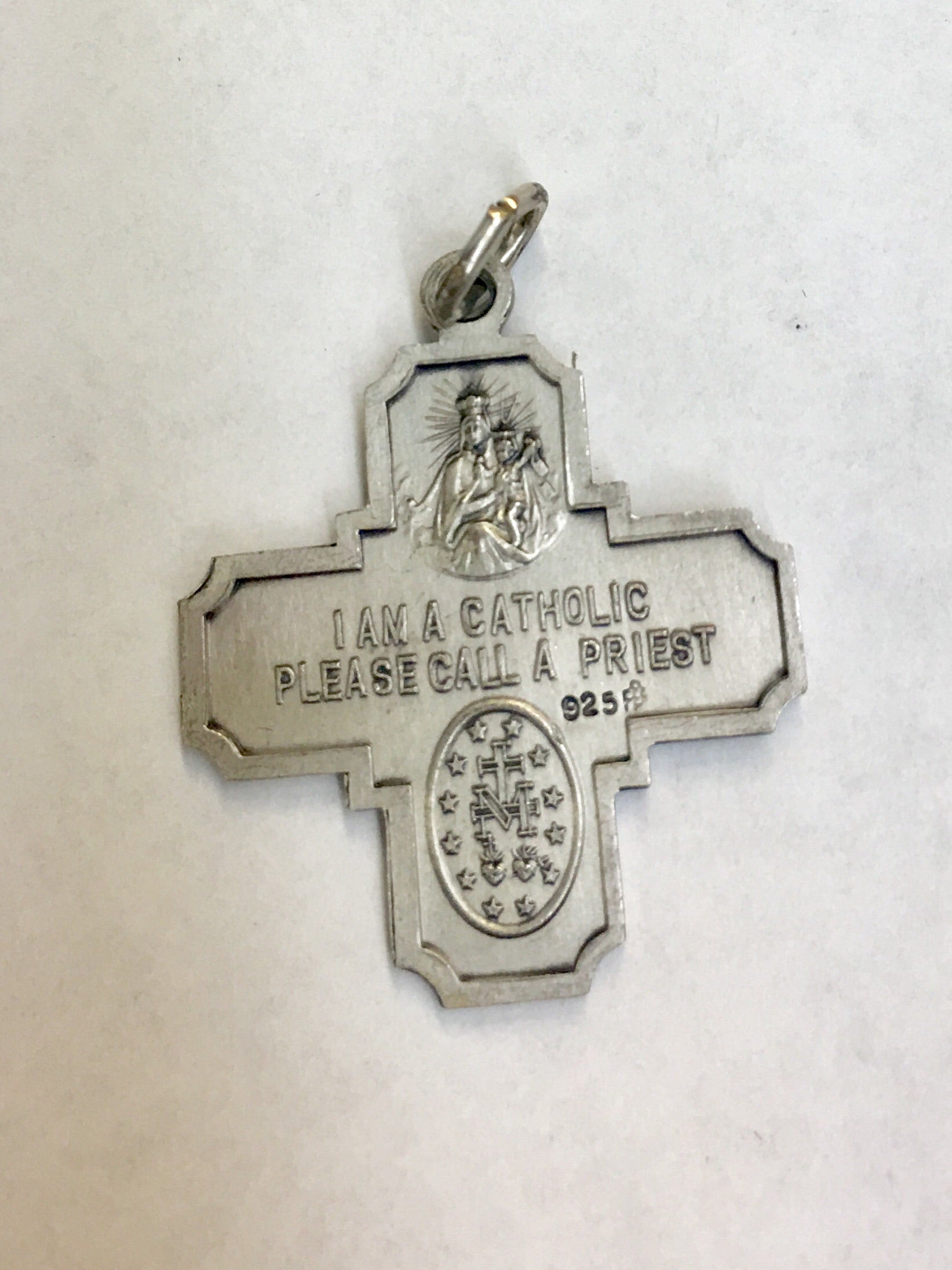 The Four-Way medal can vary in appearance, however the most popular form includes a Sacred Heart of Jesus medal, St. Christopher medal, St. Joseph medal and the Miraculous Medal.