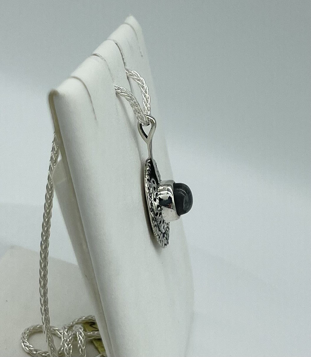 This pendant is giving Aztec vibes! She's made in sterling silver with a Labradorite stone that measures 6.9mm. The pendant, including the bail, measures 29mm in length and 19.6mm wide.